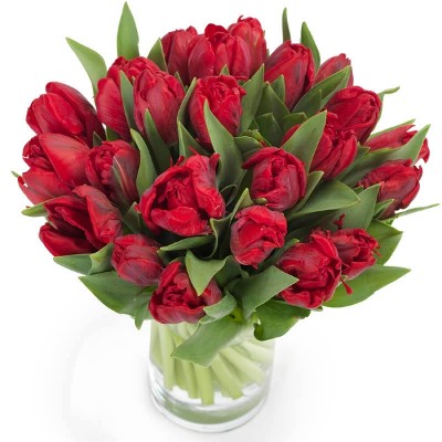Eine elegante und zugleich romantische Liebesbotschaft. Eine:r unserer lokalen Florist:innen kreiert einen handgebundenen Tulpenstrauß in Rot.