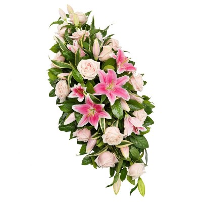 Manchmal geht es nicht mit Worten – aber mit Blumen. Sende Deinen persönliche Anteilnahme mit diesem wunderschönen Trauergesteck aus Rosen, Stargazer-Lilien und saisonalem Grün.