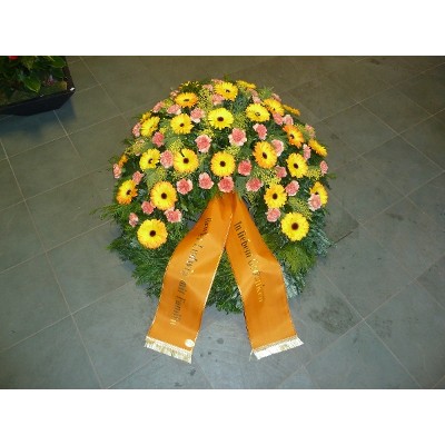 Trauerkranz auf Reisigunterlage. Wirkungsvoll und lokal sehr beliebt. Verschiedenste Farbwünsche möglich. Schleifentext bitte an: blumenmaier@aon.at